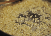 Meanwhile, heat the chicken stock in a small covered saucepan. Leave it on low heat to simmer.